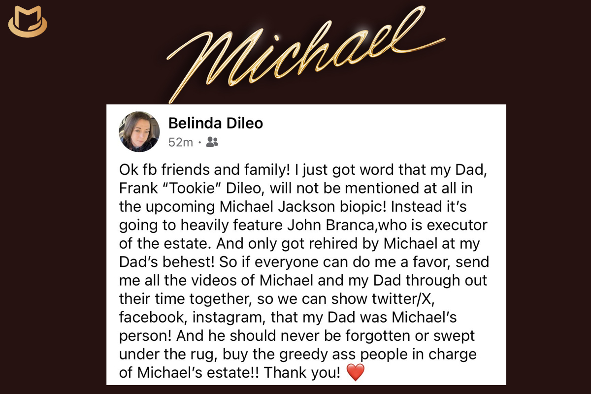 خب دوستان و خانواده فیسبوک! همین الان شنیدم که در فیلم زندگینامه مایکل جکسون که به زودی اکران میشود، اصلاً اسمی از پدرم، فرانک «Tookie» دیلئو، برده نخواهد شد! در عوض، قرار است جان برانکا، که مجری اموال مایکل است، حضور پررنگی داشته باشد. او فقط به دستور پدرم توسط مایکل دوباره استخدام شده است! پس اگر کسی میتواند لطفی در حق من بکند، تمام ویدیوهای مایکل و پدرم را در طول دوران با هم بودنشان برایم بفرستد تا بتوانیم به توییتر/ایکس، فیسبوک، اینستاگرام نشان دهیم که پدرم شخص مایکل بود! و او هرگز نباید فراموش شود یا به افراد حریص و بیعرضه مسئول اموال مایکل، بیاعتنایی شود!! متشکرم!